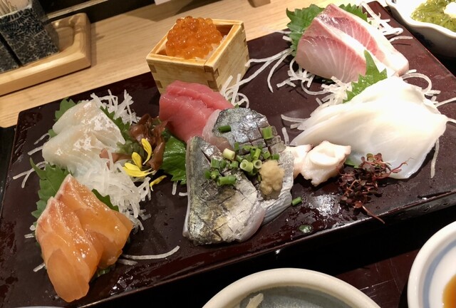 刺身定食。魚の種類は多く、肉厚のお刺身、とても美味しかったです。