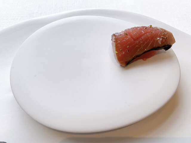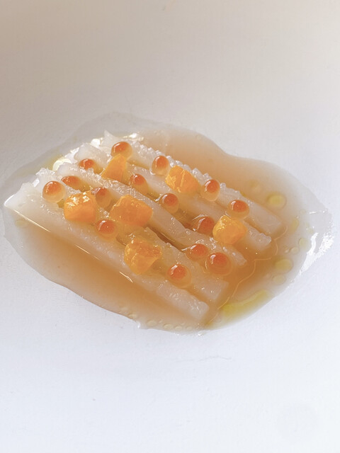 とても品のいい鰤と大根、キュウイ、生姜のわずかな香。ブリ大根とは似つかぬお味ですが、大変美味しく、生姜と鰤が合うのが驚きでした。