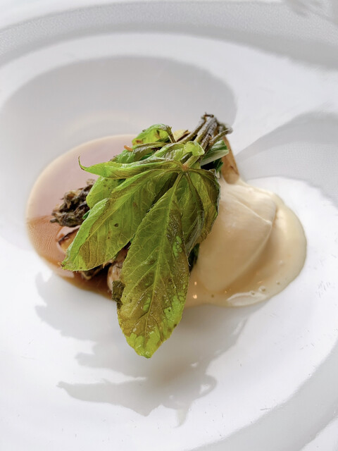 北寄貝。肉厚で柔らかく、ジューシー。お出汁とほうれん草と少しのバターで。大変美味しい。
