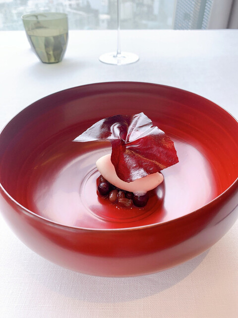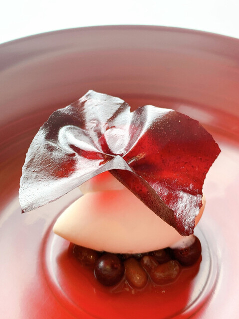 いちごベースの赤い部分と、薄いお餅の白い部分を合わせていただく、趣向の凝ったもの。