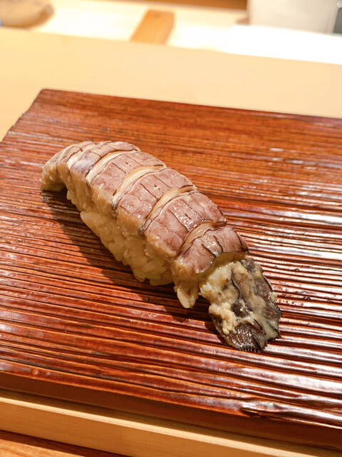 シャリは遠野4号。穀物の食感を感じるやや硬めの炊き具合。準備中に飛び込み営業に来た営業さんが、星付の各店を回ったが断られ、きむらさんにとびこみに来たエピソード。試しに食べたら良かったのと、悦外陣が好きで同じ米農家さんが作ったお米で気に入ったことから、現在のお米を選んだ由縁を聞かせていただきました。