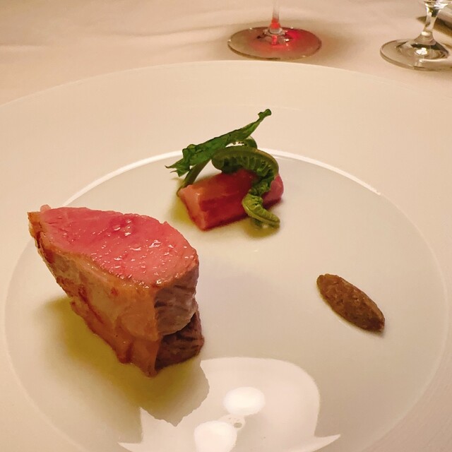 五皿目は鹿です。焼き加減がとても良く、周囲は良いお肉はちゃんと焼いた風味がします。中は生すぎずほどよく火が通っていて、鹿の野生の味わいがちゃんとしています。
