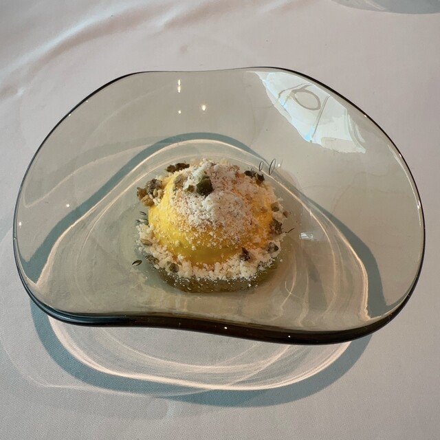 アミューズはシグネチャーディッシュのつや姫とミルクからの雪の結晶。毛蟹の風味と濃厚なクリームの組み合わせが美味しく、シャンパーニュとも良く合います。シグネチャーというだけのお味でした。