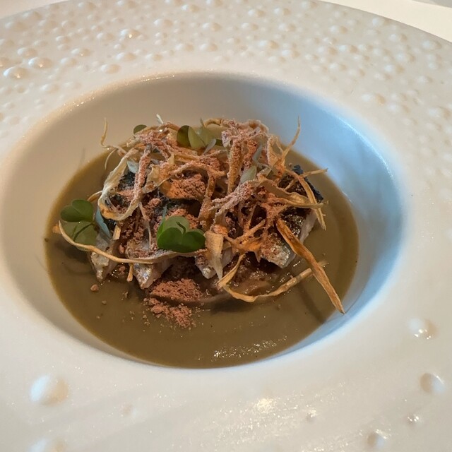 二皿目は秋刀魚とごぼうで仕立てたペーストの上に秋刀魚の炙りと、細切りごぼうの素揚げ。魚の程よいあおくささと牛蒡が絡み合いとても美味しい。