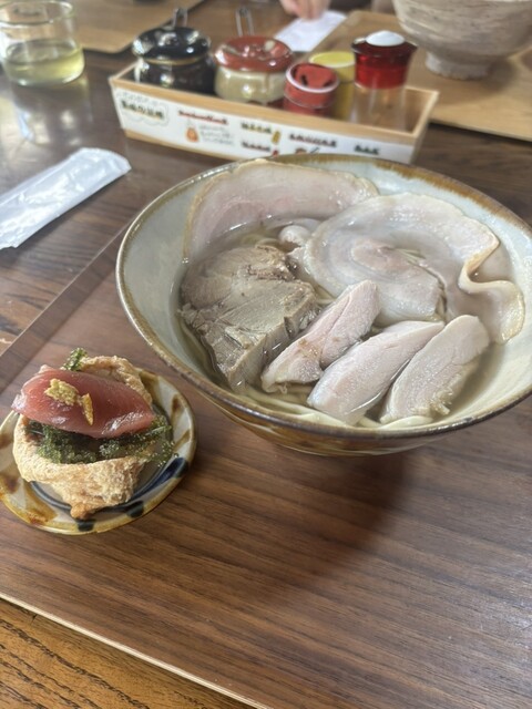 自称沖縄そばマイスターの地元のお客様から1番のお勧めと教えていただいたお店に那覇出張中にお伺いできました。県外の人間が個人的な見解で評価させていただきます。スペシャルそばとマグロと海ぶどういなりを注文。そばのトッピングは鶏もも肉・三枚肉・アグー腕肉チャーシューで。県外の皆さんが想像する沖縄そばのレベルを超えてます!麺はかろうじて沖縄そば感がありましたが、完全に行列ができるラーメン屋さんと同等w特におすすめは鶏もも肉です。マジうま〜。マイスター様ありがとう!