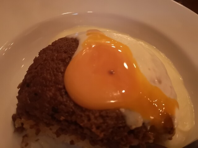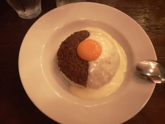 続いてチーズがトッピングされた部分はとろけたチーズでマイルドな味わい。チーズの塩味でお口が少しリフレッシュしますね。また頂点の卵黄を崩してカレーと和えるとこれまた辛みが抑えられて柔らかくまとまります。とにかく丁寧な仕事ぶりは専門店レベルですね。Barのカレーが美味しい説を裏付ける名店と言えましょう。