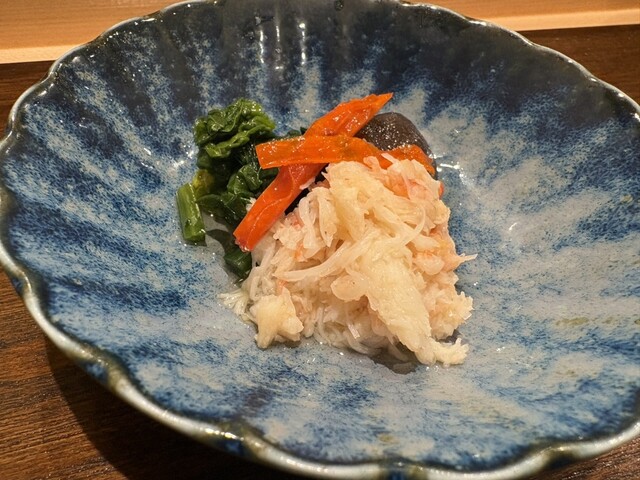 一日4組限定、完全個室。清潔感ある落ち着いた空間。専属の板さんが個室内のライブキッチンで調理。なんという贅沢。タラバは時価。本日は根室産2.5キロのタラバ。税抜5万円のコースをいただく。最初に生きてい...