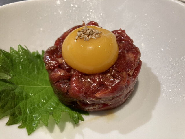 黒毛和牛のカルパッチョからスタート。濃厚な旨味の強い和牛刺しに卵黄と甘めのコクがあるタレが見事にマッチ。筋がなくスーッと入ってくる感じ。