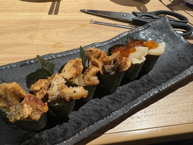 開幕ははまぐりと牡蠣を焼くべし。はまぐりの汁が旨いのよ。牡蠣もでかくてぷりぷり。卓上のQRで焼き鳥と寿司が注文出来る!ポチポチ。ライブキッチンからお呼びが。とにかく忙しい…。
