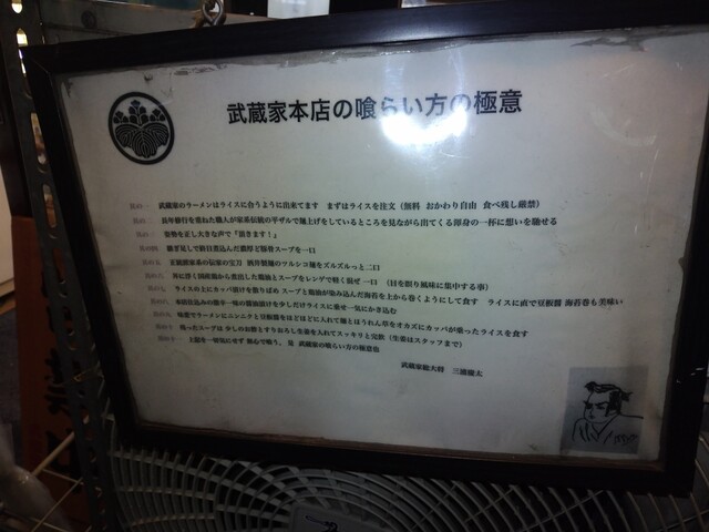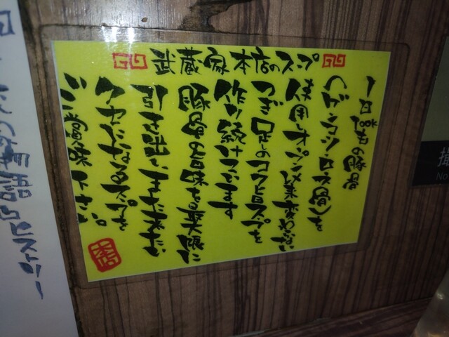 新中野の武蔵家はたかさご家(吉村家→本牧家→六角家→たかさご家の系譜)出身の菅沼氏が1997年創業、現在は三浦慶太氏を総大将として、20店以上の支店、暖簾分け店も入れると90店以上とも言われている家系の代表的なグループ。吉祥寺の武蔵家は六角家出身、1999年創業で別系統。