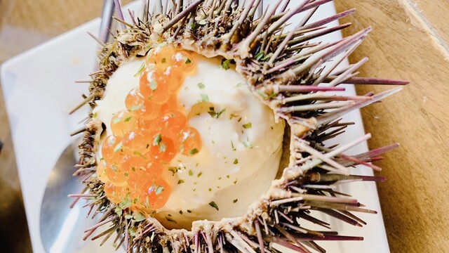 生牡蠣旨ー♪カルパッチョも2人で全種類堪能出来て珍しいキビナゴなんかも入って楽しい(*^▽^*)牡蠣フライは火傷注意!タルタルも美味しいけど、テーブルにあるポン酢っぽいのも合う〜^ - ^生うにプリンは見た目殻を使ってるからその名前だけど、生の雲丹は残念ながら入っていないので少し残念)^o^(