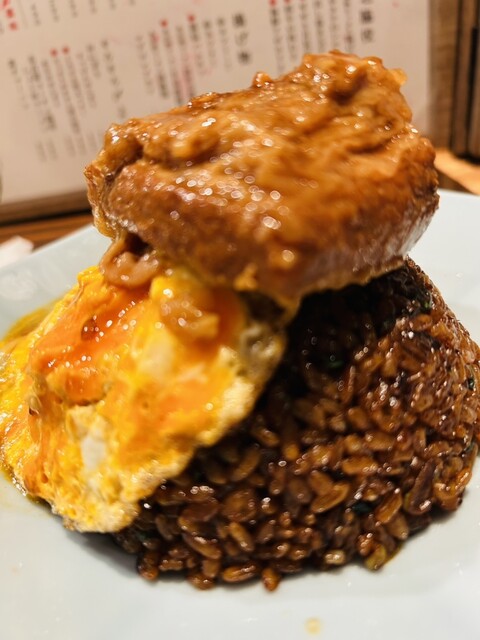 黒チャーハンは他の客が頼んで店員さんにそれは何ですか?と尋ねて思わず追加したビジュアル最高の逸品で少し苦味のある焦がしにんにくチャーハンの上にオムレツそして煮込み煮込まれた牛がチョモランマの如くトッピングされた素敵な逸品。これが合わさると最高のお味になりますψ(`∇´)ψ