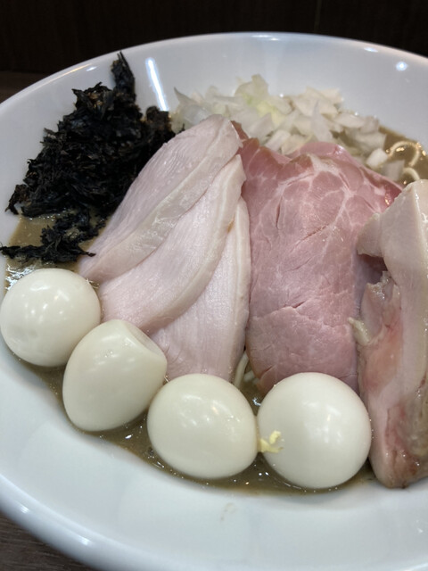 鶏レアチャーシューが3枚、うずら味玉5個が麺を覆い隠しています。