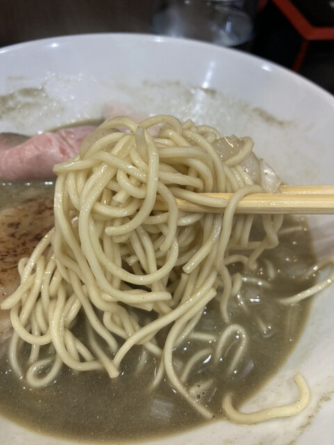 湯煎でもこれだけの香りが立ち上るスープ、またビターな煮干感もしっかり前面に出してくるスープは、家庭で作れるレベルを超越しています。
