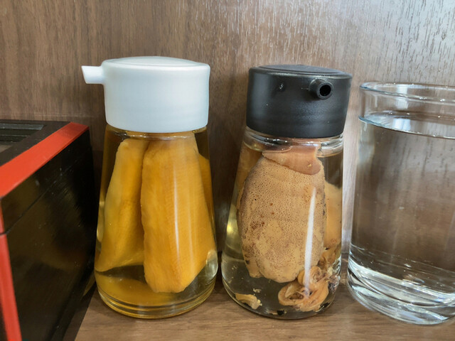 和歌山県・紀州南高梅に愛媛の七折小梅を使ったママ自家製の梅ソーダは、先に提供していただき、食事と一緒にいただきます。