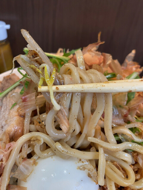 冷えた豆乳が食欲を誘い、節と桜海老の香りを嗅ぎながら、両手に箸を持ちながら、下から上に麺をかき混ぜながら、芝麻醬とラー油を全体的に絡ませます。
