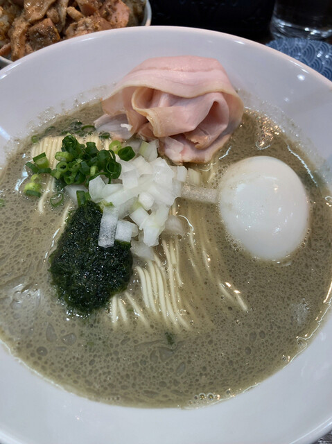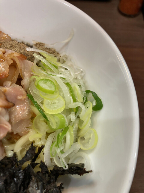 トッピングは、大判レアチャーシュー、長葱の粗切り、メンマ、半熟卵、辛味となります。