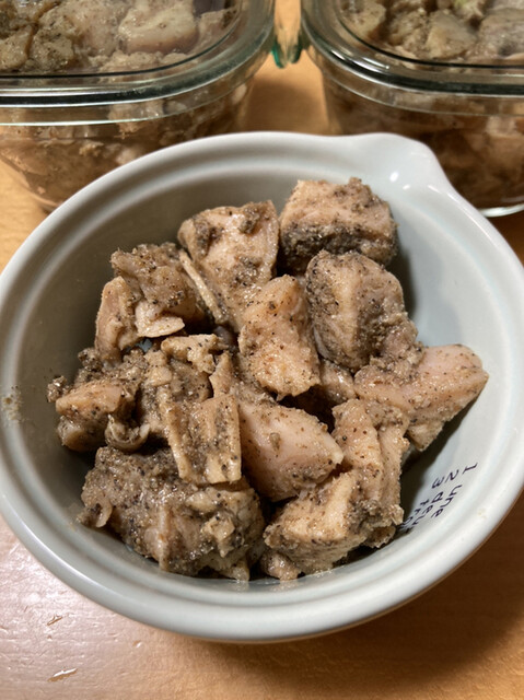 先日購入したお持ち帰りの肉タネ「ニボニンニク」に、ジョセフィーヌドレッシングと黒胡椒をかけていただきます‼︎