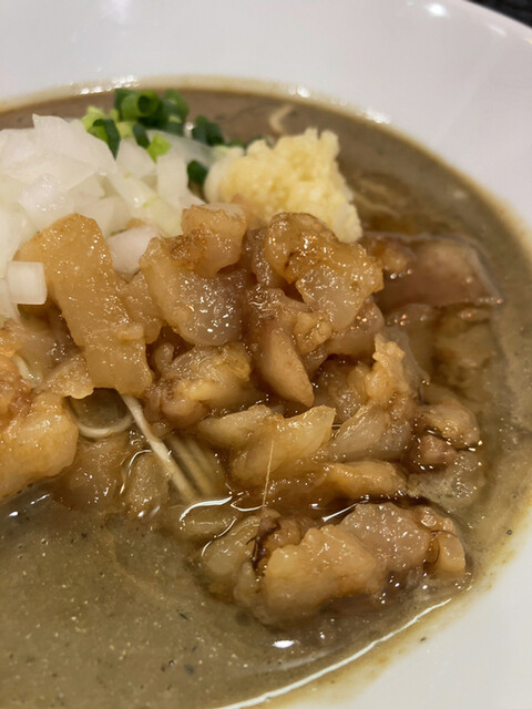 つけ汁には、大量のチャーシューが入っていて、極厚切りの豚バラチャとホロホロなウデ肉がこれでもかと入っています。