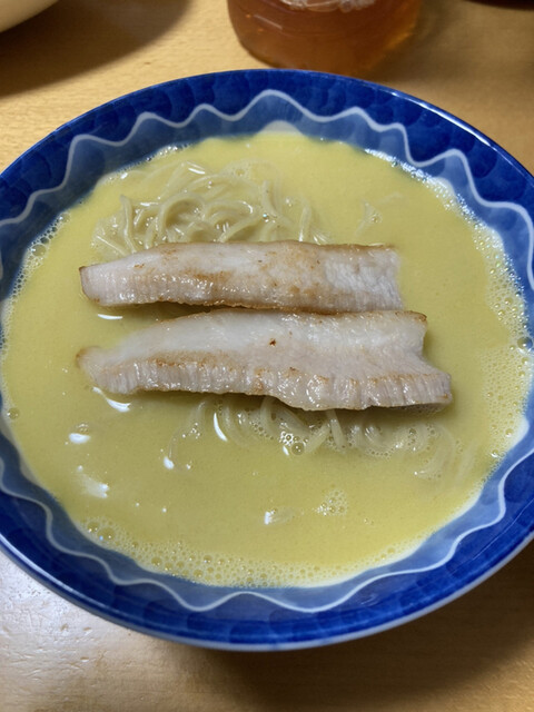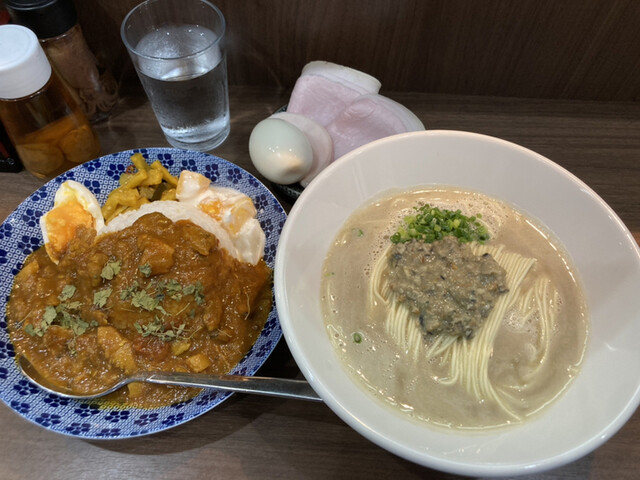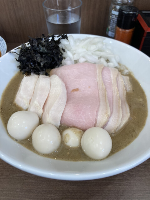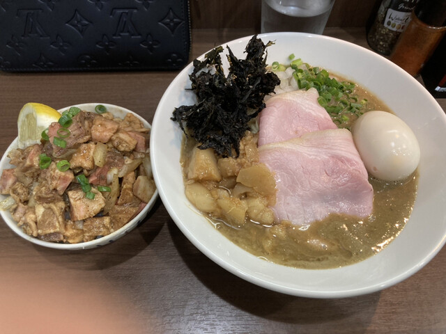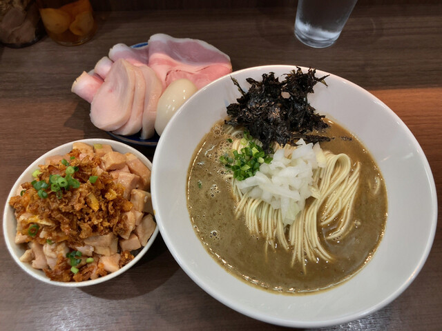 スープの構成は、牛×豚×鶏の白湯スープに九十九里×長崎2種×京都でぽったり炊かれていて、濃度は濃厚煮干に近い仕様になります。