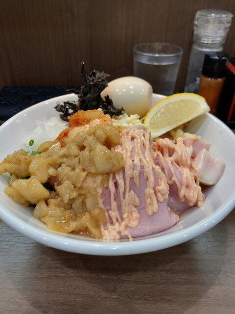 肉増し炙りブタ、味付きアブラ、すだち、煮干粉、芽ねぎ、玉葱、フライドオニオン、岩海苔、コールのニンニクとなります。