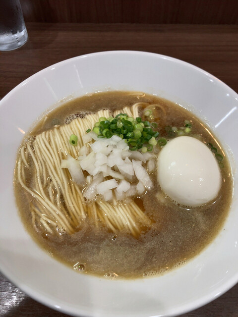 提供された一杯は、中濃セメント煮干スープの上に、担々のような赤みを纏った背脂と玉葱、芽ねぎ、半熟卵が乗っています。