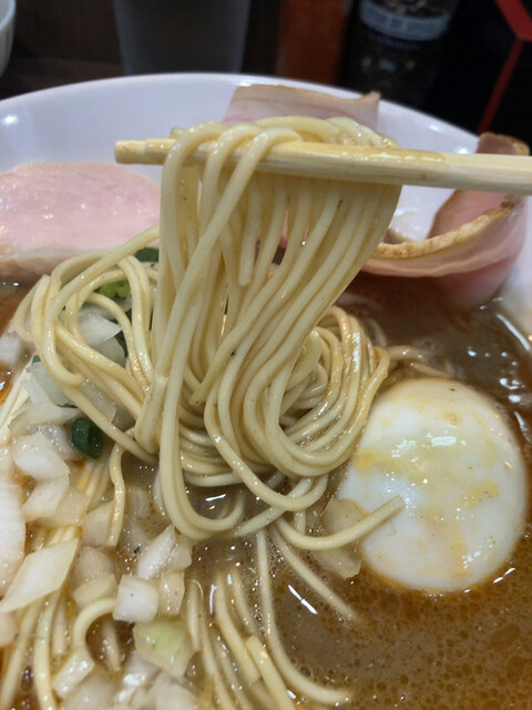 煮干粉の香りがしっかりしていて、フライドオニオンの甘さが後押ししています。