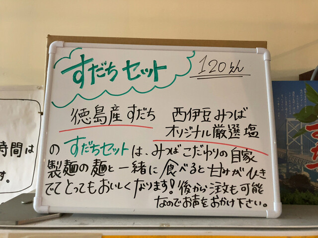 ビジュアルは神奈川県鎌倉市にある中華蕎麦沙羅善のような盛り付けであり、麺の美味しさを感じるために、徳島産すだちと特選塩で麺だけを楽しむことが出来ます。