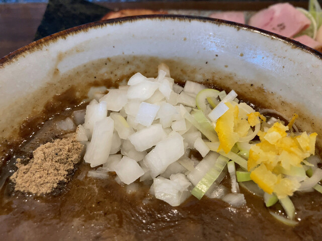 つけ汁は、最初に香りを近づけると、魚介の骨太な旨みと豚の厚みが混ざり合った、じんわり濃密な香りが立ち上がります。