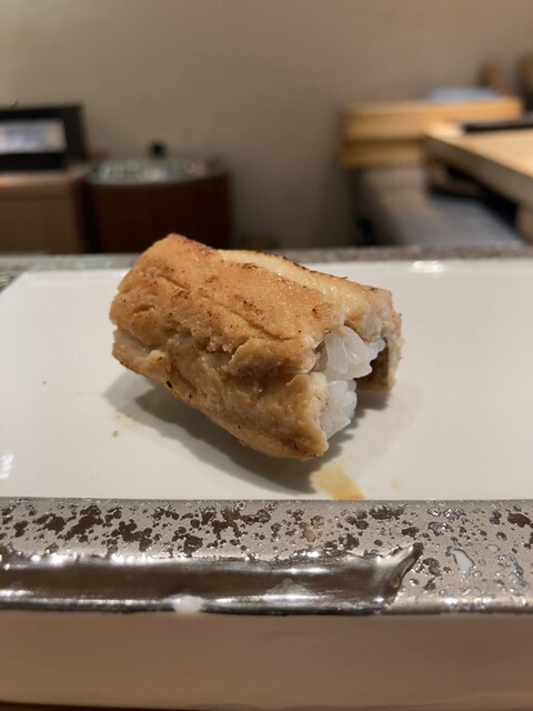 大将からのサービスです。ほろっと崩れそうな位の柔らかさです。甘だれのない、煮穴子で穴子の味わいをダイレクトで感じられます。