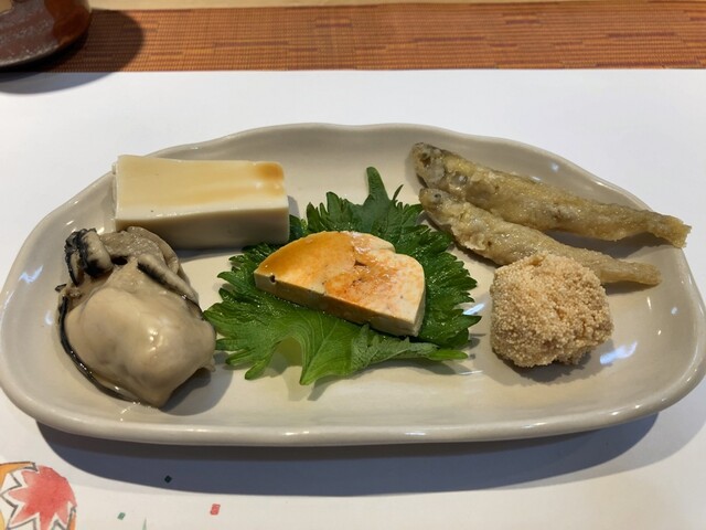 ・先付き5種(あん肝、蛸の卵煮、ニシンの西京漬け、自家製濃厚豆腐、べったら漬け)