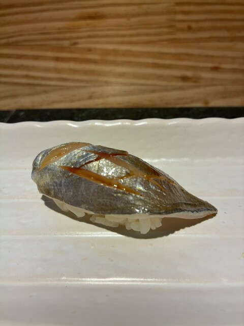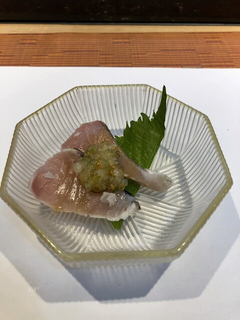 今日1の一貫です‼︎久しぶりに関あじをいただきますが、なんと「かぶら」の薄切りを関あじに乗せていただきます。味の濃い関あじに、かぶらの塩味がバッチリ‼︎こんなの食べた事がない。