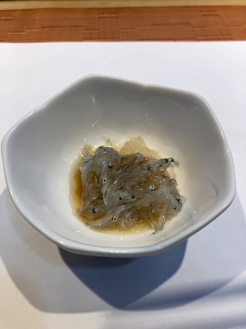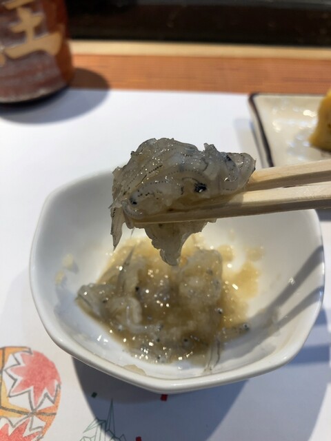大将の手渡しでいただきます。手の感覚でも味合わせてくれる憎い演出です。いや、柔らかすぎて手から手じゃないと食べられないのか。温かく蒸されたシラウオの濃厚な旨みを感じます。
