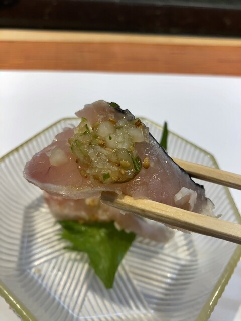 ピンク色の身に、焼き目、山形県ダシのような薬味のコントラストが美しいです。サワラの旨味がギュと締まっています。
