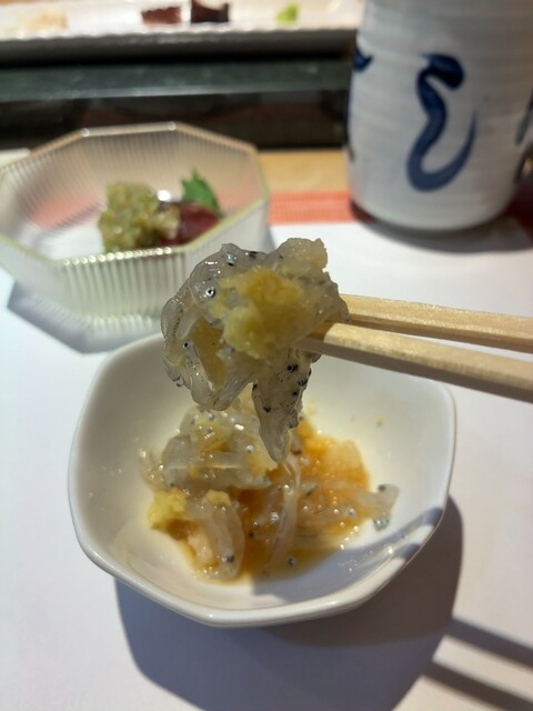 静岡県産になります。生しらすの下に大根があり、少し辛みが強いが、生しらすの甘みとのコントラストが秀逸です。生姜もピリッとアクセントになっています。