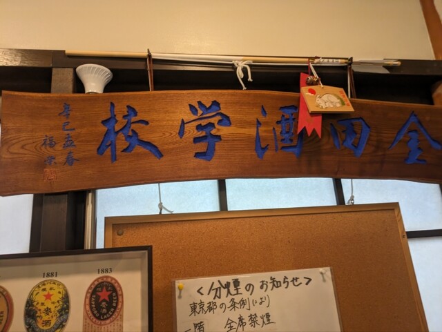 初めて知りましたが、3階まであるんですか? この日は閉めていたようですが。それから、口コミ等にありましたが、たしかに「金田酒学校」と飾ってありました。創業は昭和11年なんでしょうか。これも初めて知りました。ちなみにとなりは20歳代とおぼしき女生徒1人客でした。誰もが落ち着いて飲めて食べれる場所、これ最高ですね。