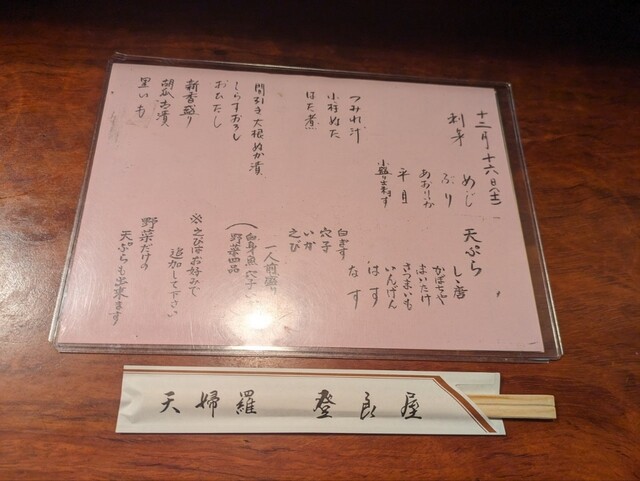 2022, 2023百名店らしいので1人で行ってみました。天婦羅はお好みで海老✕2、白身魚(キスがなくて平目?)、いか、しし唐、なす、と、ご飯のセット、つみれ汁、ビール中瓶をいただいて、しめて¥6,105。