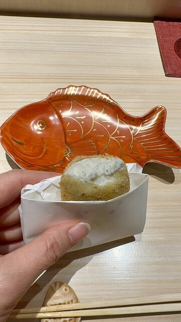 看板メニューの揚げたてコロッケは中にお鮨屋さんならでは!の意外な素材が入っていたり