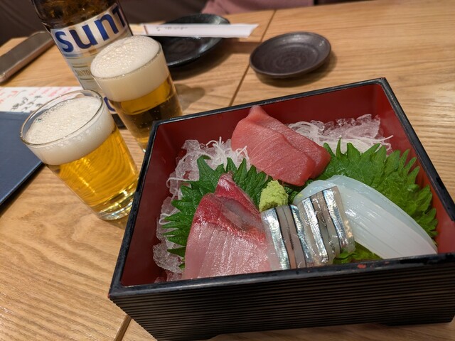 お通しの刺身盛り合わせは、まぐろ・きびなご・イカ・はまち!最初からハイペースで飲めるラインナップ。酒好きには嬉しい。