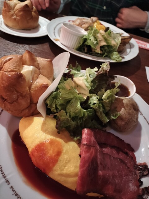 今回は、オムライス、ローストビーフ、そして名物のパンがセットになったプレートを注文しました。