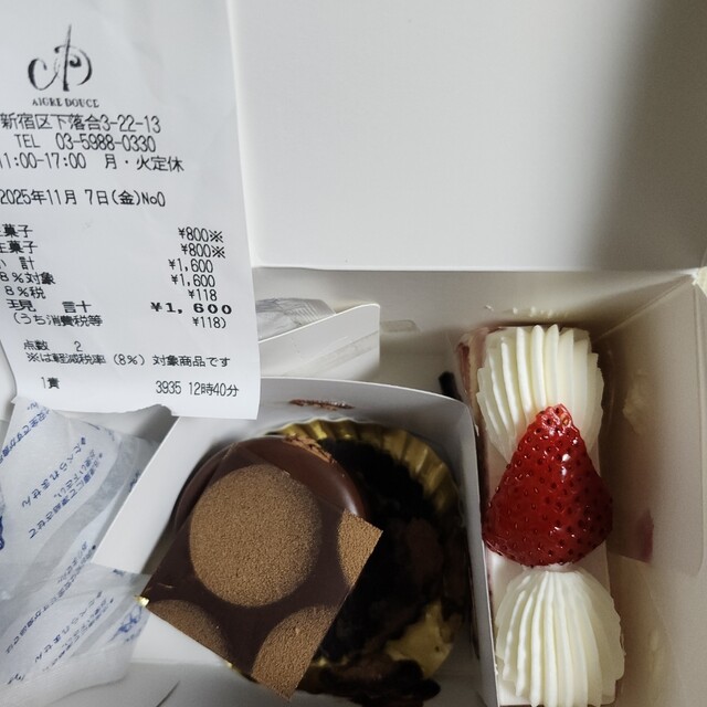 2025年11月7日うなぎ 百名店 うなぎ 目白ぞろ芽のランチ後、スイーツの購入で来店した。11時46分到着。待ち20名程度。クリスマスのケーキの予約をしており、いつもこんなに混んでいるかはわからない。12時2分入店。シャンティフレーズ800円、エクセランス800円を購入する。12時17分店を出る。シャンティは、イチゴ、クリームが美味しい。エクセランスが、チョコ濃厚で美味しい。全体的に美味しいケーキです。さすが百名店です。ごちそうさまです。また、購入したい。