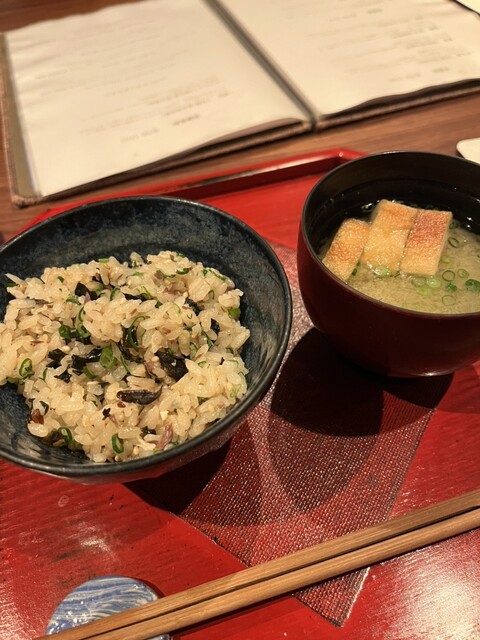 ・味噌汁 最後のお椀の塩味がくっきりしておりこれで丁度良いです。焼き目が付いた揚げがカリッと香ばしい。とろろ昆布とコントラストになっている。