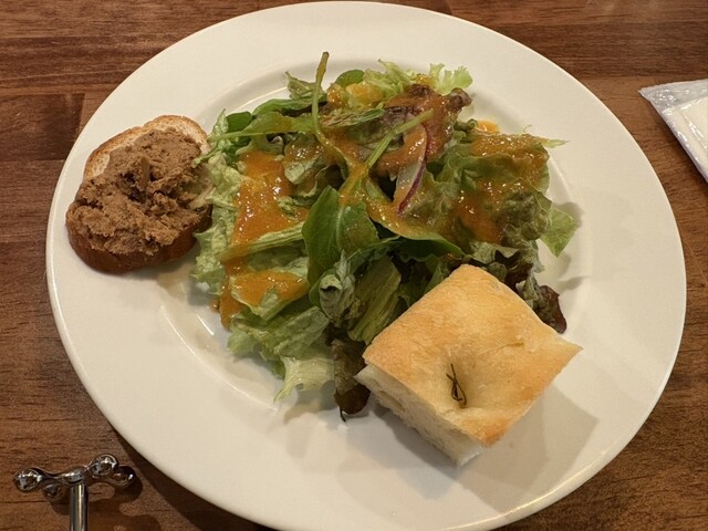 ミニサラダがミニじゃない! たっぷりサラダに、絶品リエットが載ったブルスケッタ、ローズマリーのフォカッチャが添えてある。