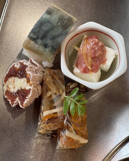 「枡盛り」クリームチーズ酒盗掛け、ほぐし豚のポテトサラダ、柚子の香豆腐、蟹膾、干し柿胡桃バター、数の子松前漬け、河豚皮煮凝り、鯖棒寿司