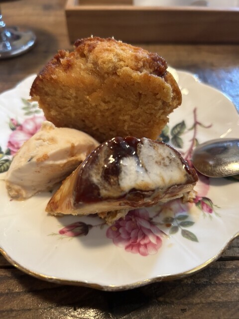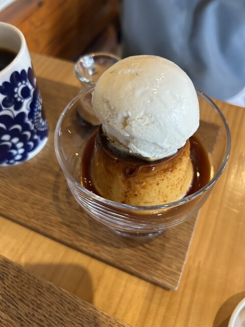 お目当てのプリンと登場!なめらかな舌触り、香り高いプリンは程良い甘みで全く飽きない。さわやかなアイスクリーム、セットで頼んだエルサルバドル珈琲の苦味との組み合わせも申し分なし。