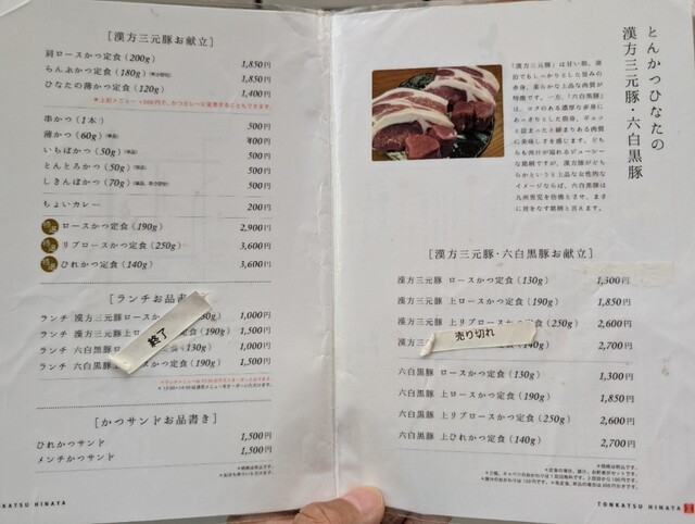ここ2週間くらい、『とんかつひなた』に行く機会を探しておりました。土曜日だとランチメニューも行けますし、ウィークデイは閉店間際を考えてました。でもタイミングが合わなくてずっと行けませんでした。今日は20:30ラストオーダーぎりぎりに到着しました。並びは無しでしたが、満席でした。そこから10分くらい外で待ちました。待っている間にスタッフさんが外に出てきてオーダーを取りました。この時間だと売り切れメニューも結構あります。特選シリーズは全て売り切れ、漢方三元豚の上ひれかつ定食も売り切れ。六白黒豚の上ひれかつ定食140g 2700円とシキンボ500円を注文しました。
