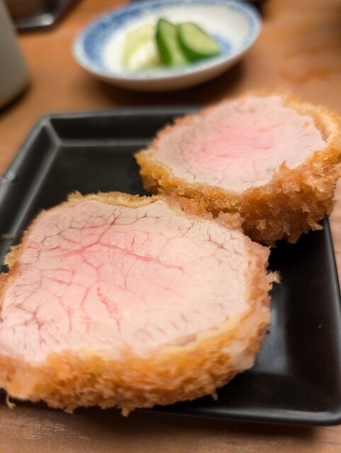 殆どの方は三元豚のロースを注文します。極稀にヒレカツ定食の方がおります。これはこれで美味しいのですけども、六白黒豚のひれカツ定食は味が濃いと言いますか、濃厚な味なんですけど、ヒレカツの持つあっさり感も有りまして私個人としてはオススメのひれカツです。特選ヒレカツは三元豚だけです。六白黒豚は上ひれカツだけなのです。特選ヒレカツが売り切れていても、こちらがあるなら是非お試し下さい。