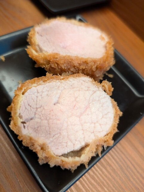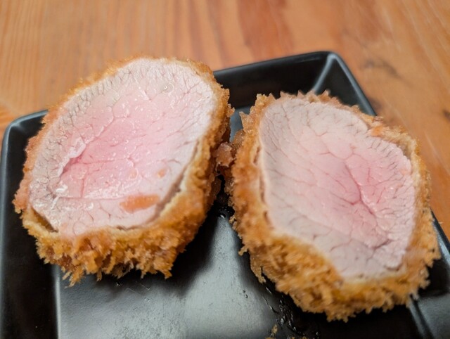今回食べた六白黒豚はお肉が三元豚ほど柔らかくはありません。しかし、味の濃さがあり深みを感じます。甘さは三元豚の方が強いです。私はこちらが結構気に入ってます。上ひれかつには漢方三元豚と六白黒豚に二種類がございますが、特選ひれかつには漢方三元豚だけです。六白黒豚の上位があるのならば試してみたかったです。