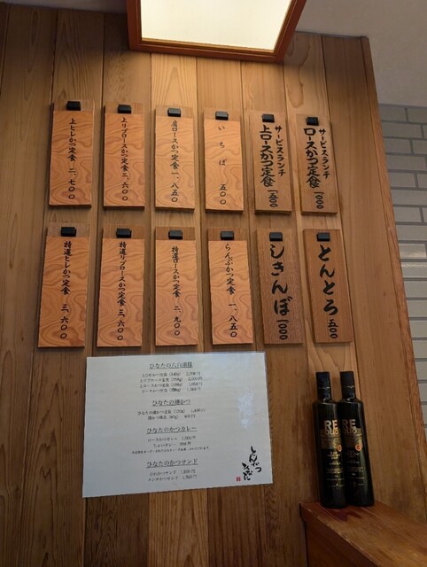 前回はお得なランチメニューの漢方三元豚の上ロース定食を頂きました。六白黒豚はどんな味なのか気になってます。でも、ランチメニューで食べれば良いので、ディナーメニューとしてひれかつ定食に決めてました。これも、種類が有りまして上ひれかつ定食2700円と特選ひれかつ定食3600円。更に漢方三元豚と六白黒豚を選べます。「とん太」の特ひれかつ定食は2600円なので、「とんかつ ひなた」の上ひれかつ定食2700円が比較しやすいと思いました。漢方三元豚は今日は売り切れ、六白黒豚の上ひれかつ定食140グラムとなりました。サイドメニューで「しきんぼかつ」というおしり近くの部位で脂身が少いとんかつ70 グラム500円を追加しました。