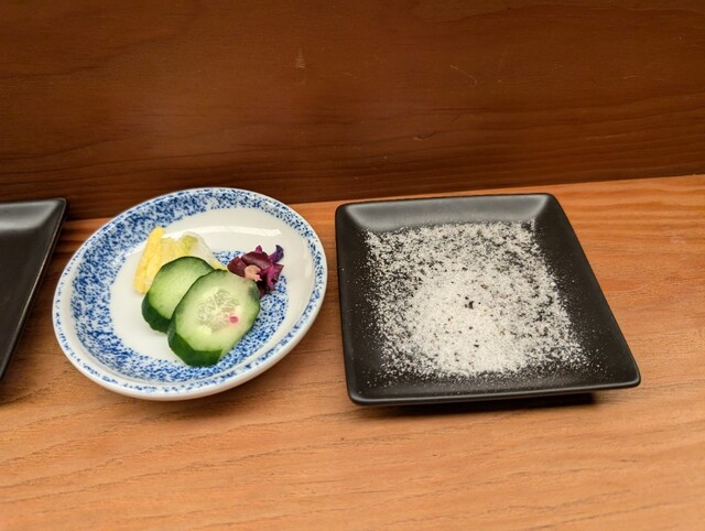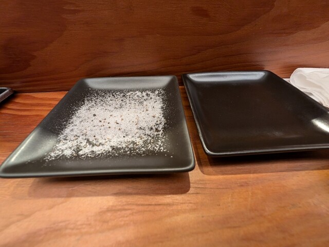 金曜日の夜営業に合わせて「特選ひれかつ定食」を目当てにやって来ました。特選ひれかつには他のメニューと同じように漢方三元豚と六白黒豚の2種類があるのだと思っていました。女性スタッフに聞くと漢方三元豚があると言ってましたが、六白黒豚がメニューとしてあるかどうかはわかりません。17時スタートには合わせられないし、以前19時半に来たときは20人以上並んでました。19時56分に来た所、12人並んでました。14人分の席です。開店時は1巡目に入れるないと結構待つことになります。大体は10人が食べ終わらないと次の補充はないようでした。しかし、この時は4人くらい出ていくと補充しておりました。なので私は25分くらいの待ちで済みました。店に案内されて15分くらいで配膳されました。座った席が真ん中辺りで、オーナーシェフが揚げている所は見えませんでした。特選定食はトリュフ塩が付いてくるのですが、テーブルにも2種類の塩が用意されています。